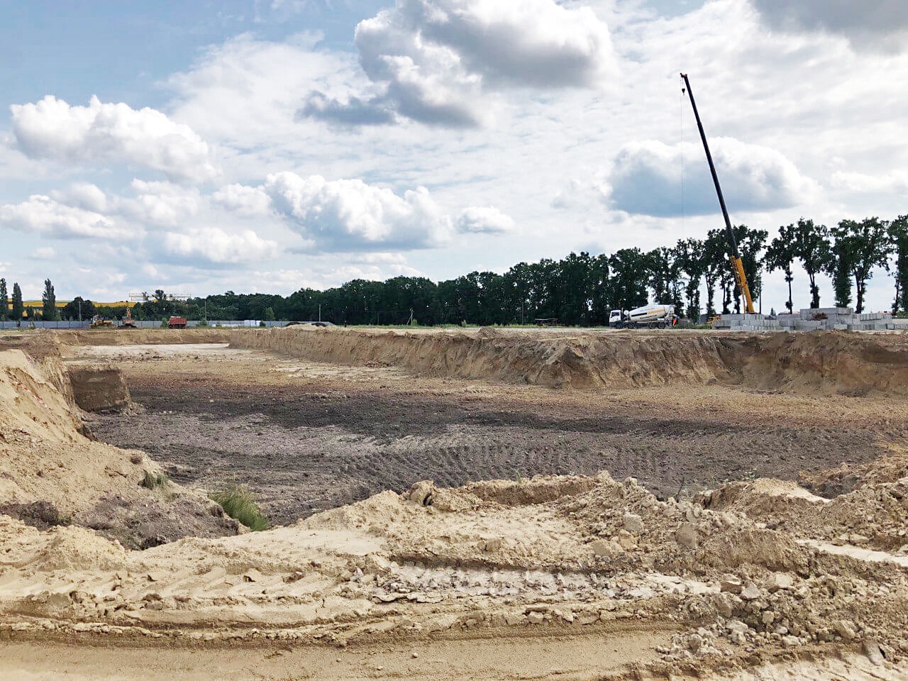 Хід будівництва червень 2023р. БУДІВНИЦТВО ПЕРШОЇ ЧЕРГИ: Влаштування фундаменту 1й будинок. Влаштування котловану під фундамент 2го будинку.