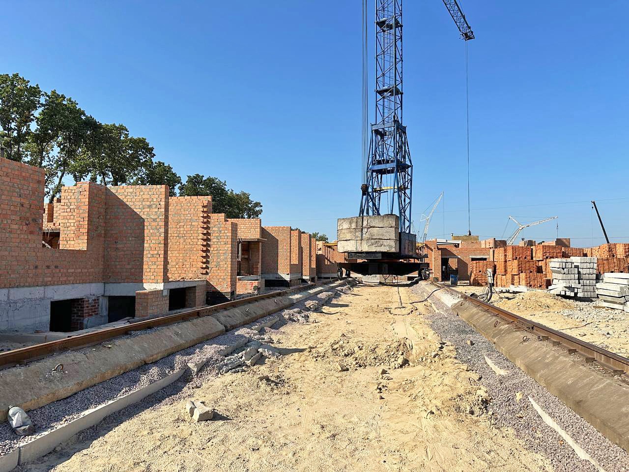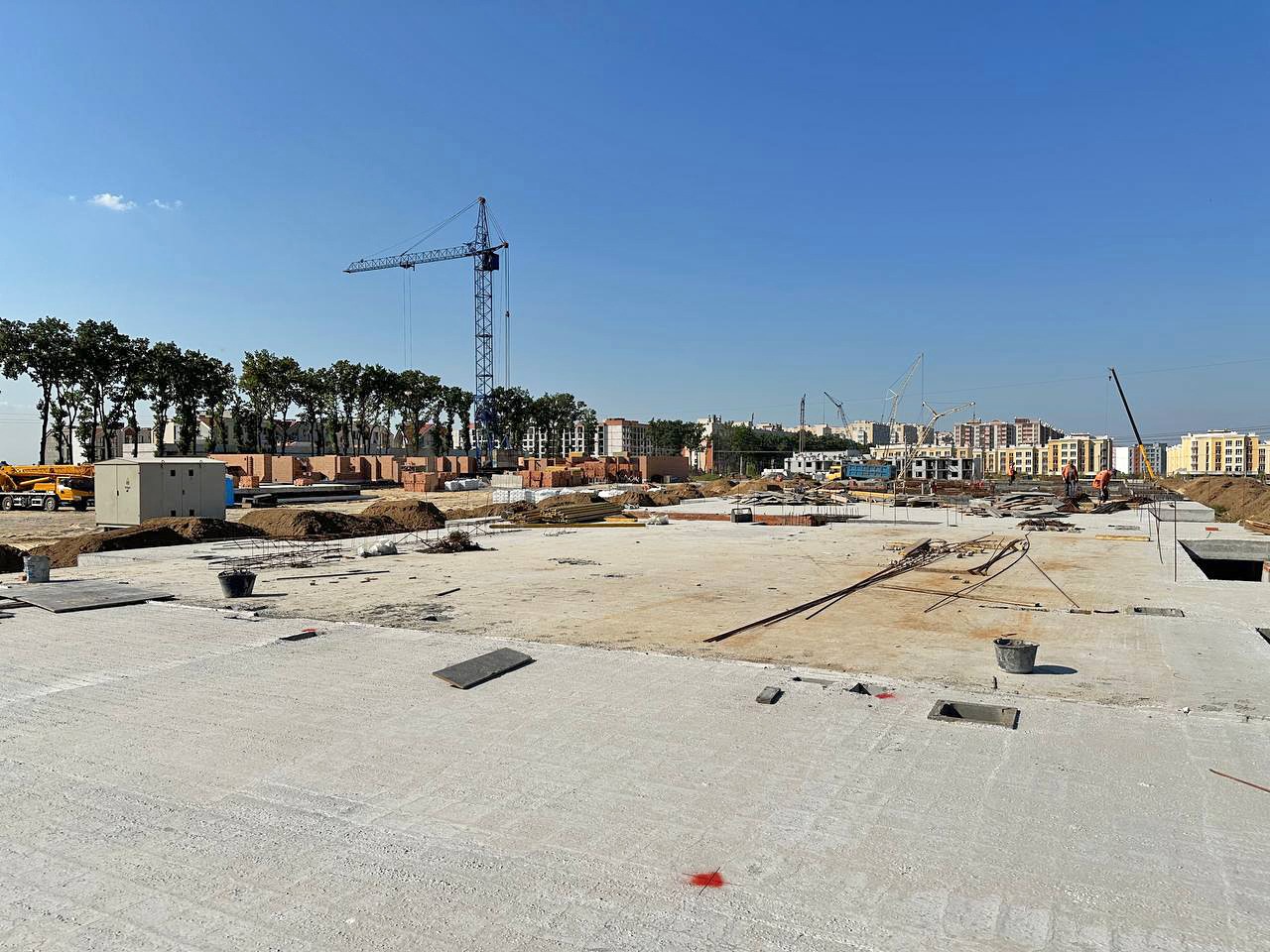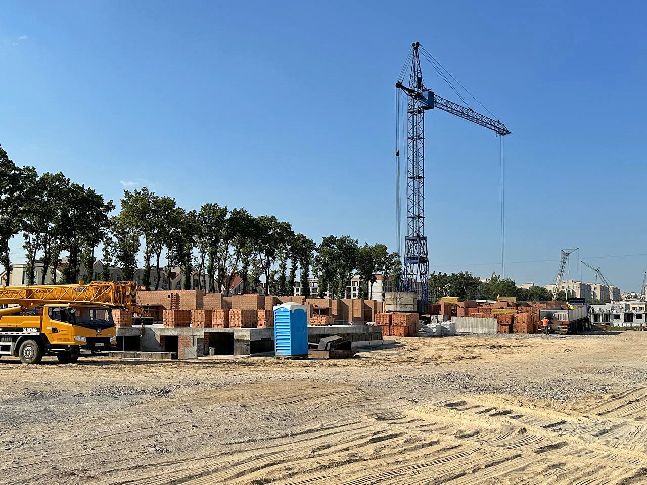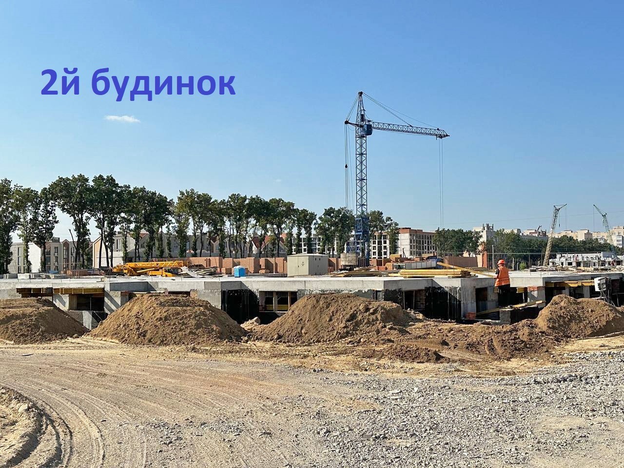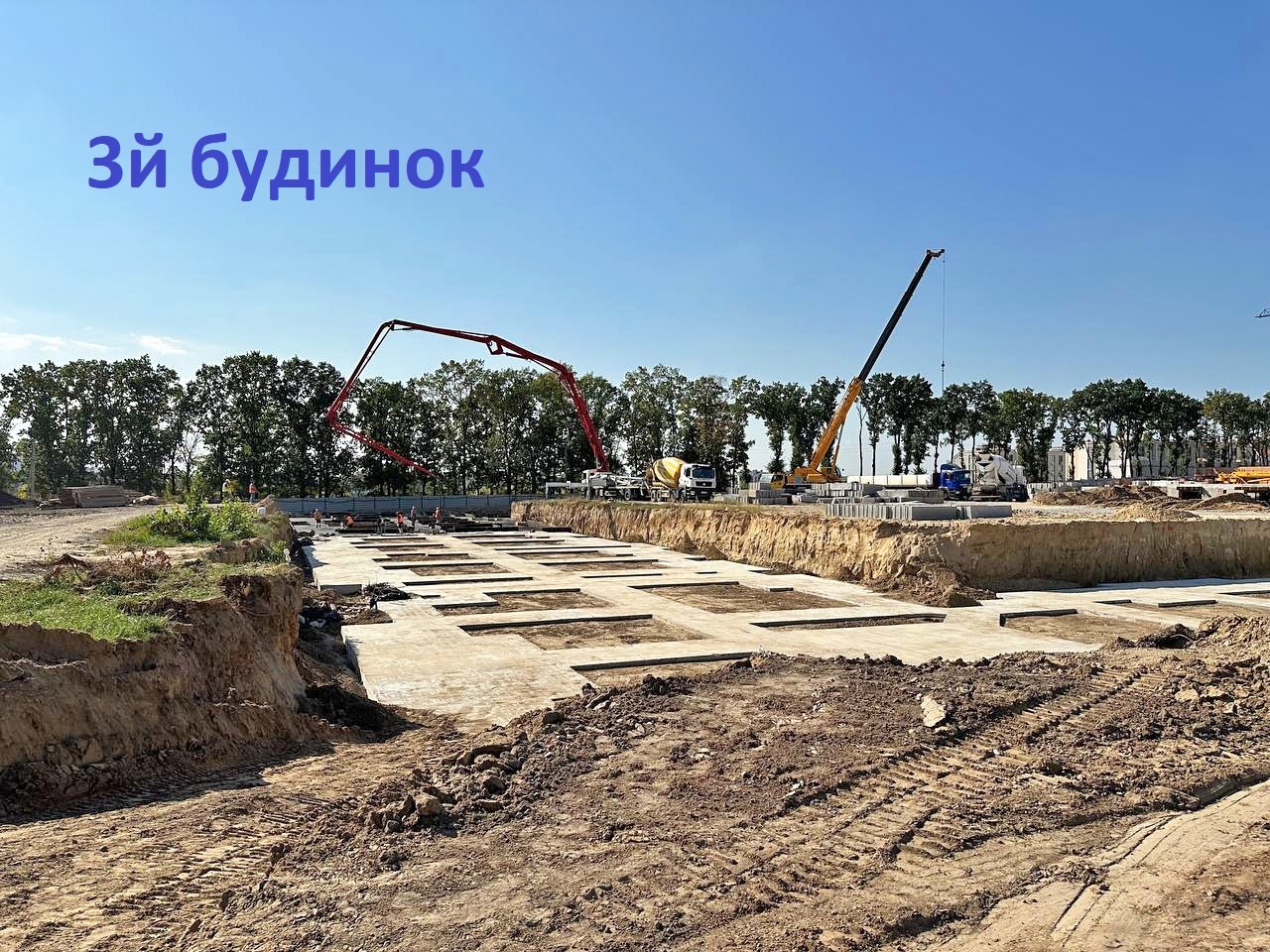 Хід будівництва липень 2023р. БУДІВНИЦТВО ПЕРШОЇ ЧЕРГИ: 1й буд. – будівництво першого поверху – 50% 2й буд. – будівництво цокольного поверху – 80% 3й буд. – влаштування фундаменту – 80%